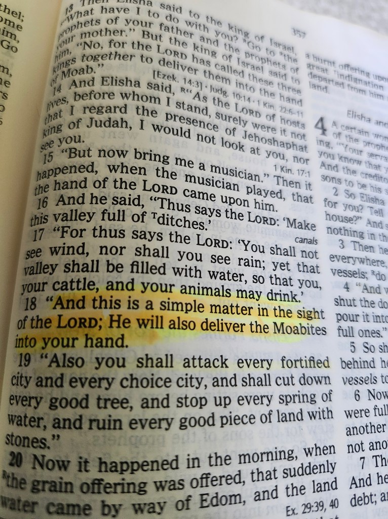 If you haven’t read 2 Kings 3, or for a while, wow, it’s an interesting situation that the God of heaven and earth shows up…………