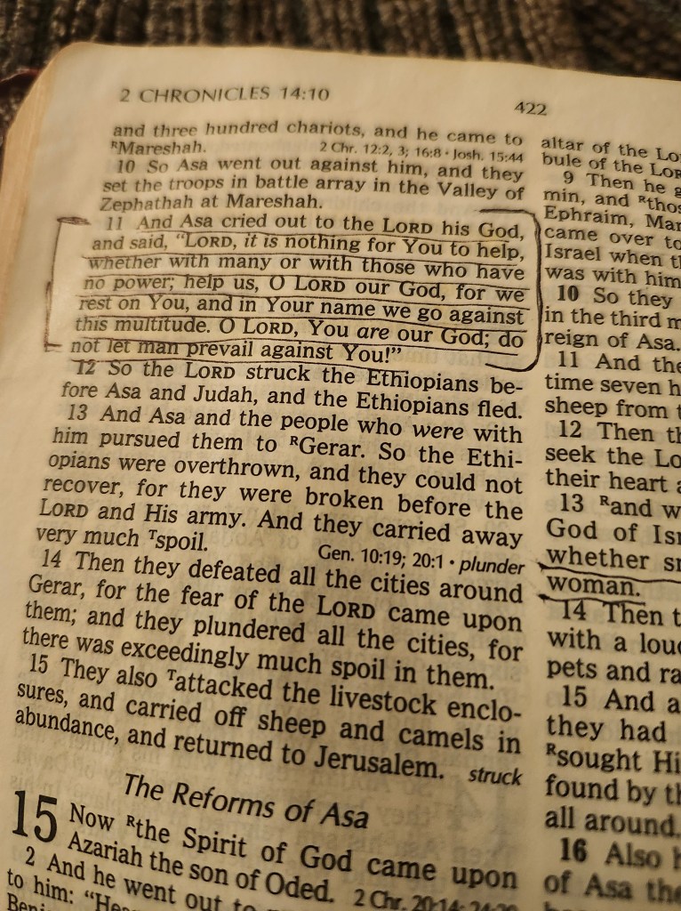 In 2 Chronicles 14:11, King Asa faced incredible odds and won because he cried out to the LORD, help us know You and to put our trust in You and not the things of this world!!……..