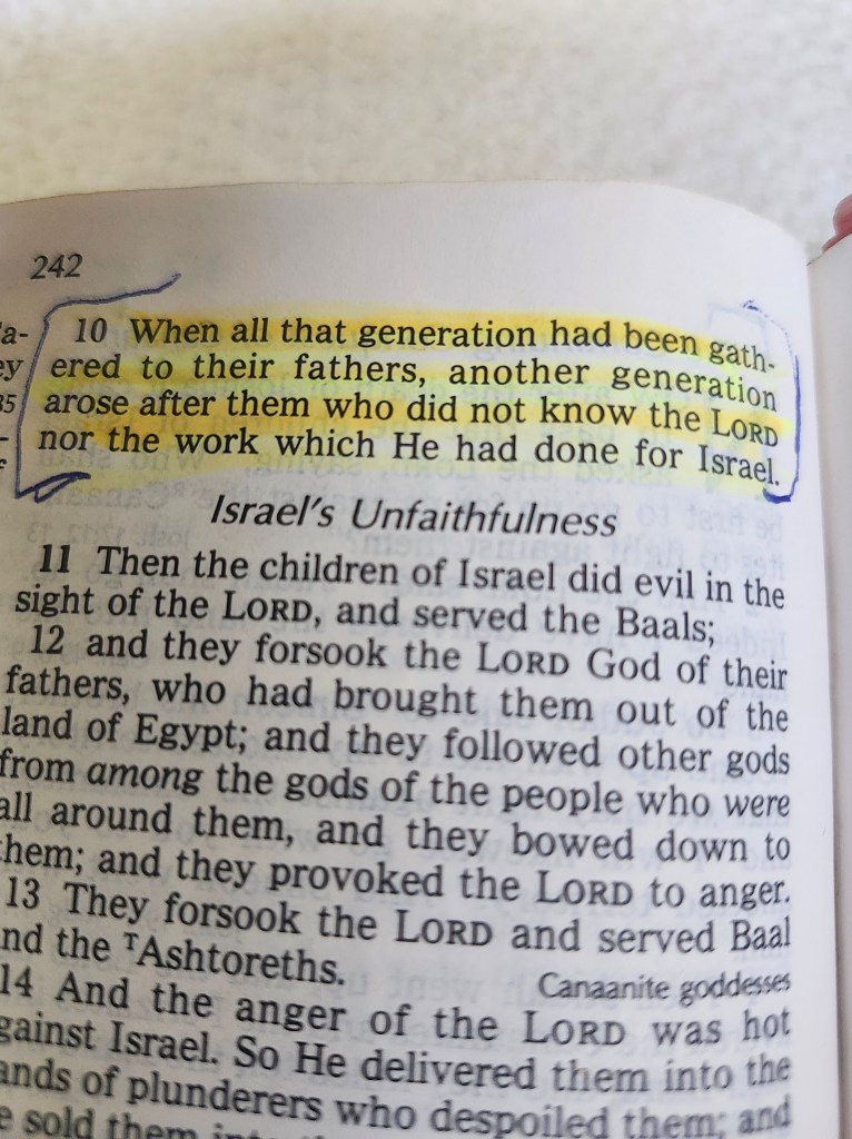 Today we come to the Book of Judges. Judges 2:10 shows what happens when one generation does not pass on the Word of the LORD……….