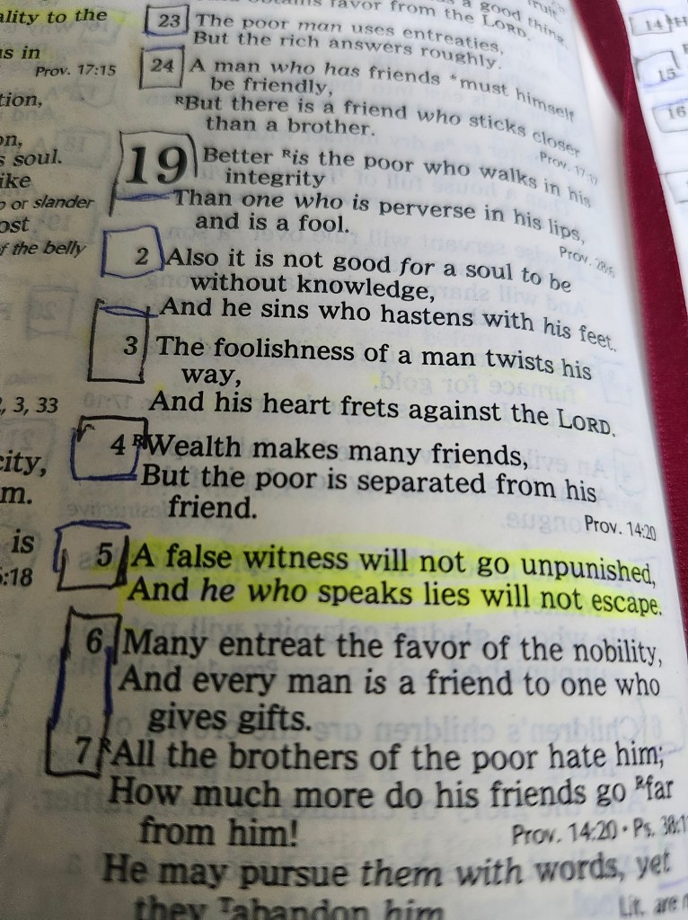 Proverbs 19:5 has much to say about those that tell lies and give false testimony. They think they will get away with it, but they will not………..