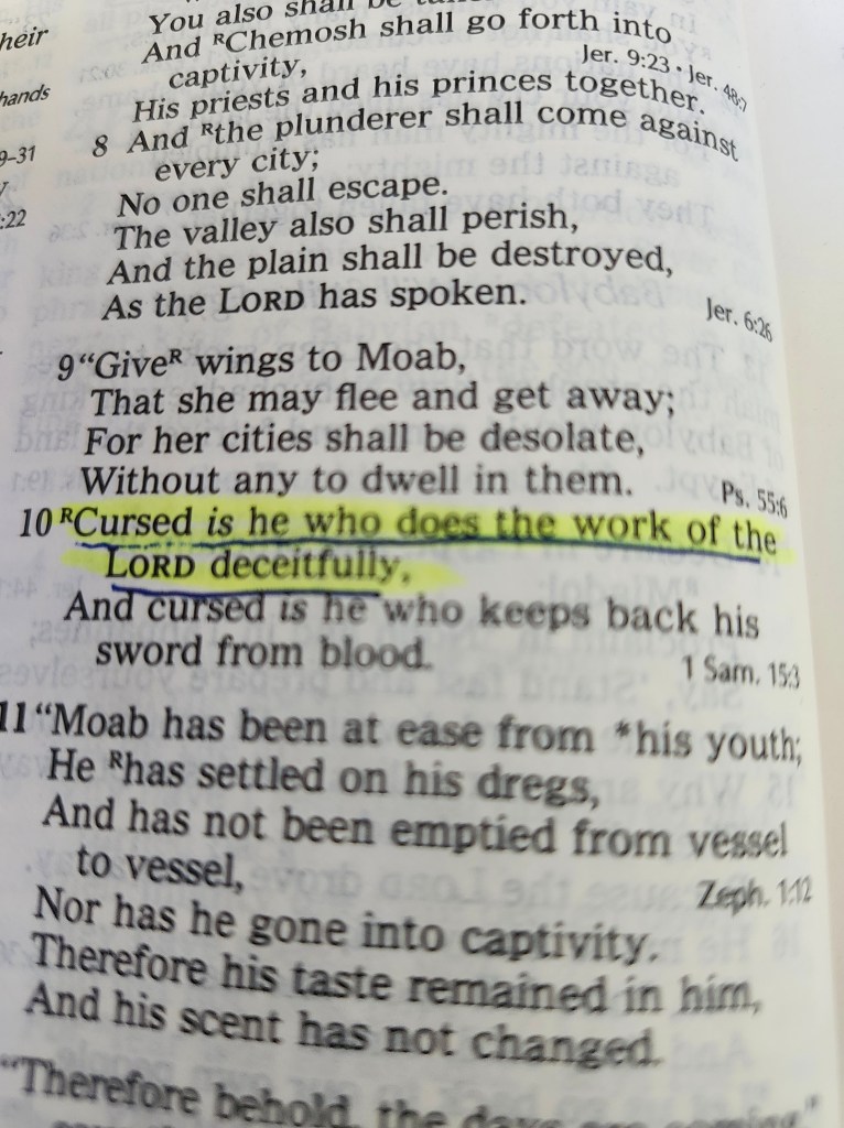 Sometimes people speak sweet and kind words, but in many places, like Jeremiah 48:10, the LORD sees through our motives……..